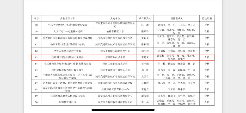 近日,陕西省教育厅办公室印发《陕西省教育厅办公室关于公布陕西省第三批社区教育实验项目结项验收结果的通知》(陕教职办〔2022〕28号),欧冠官网申报的社区教育实验项目《校地图书馆协同开展文化服务》顺利通过结题验收,验收结果为“合格”。